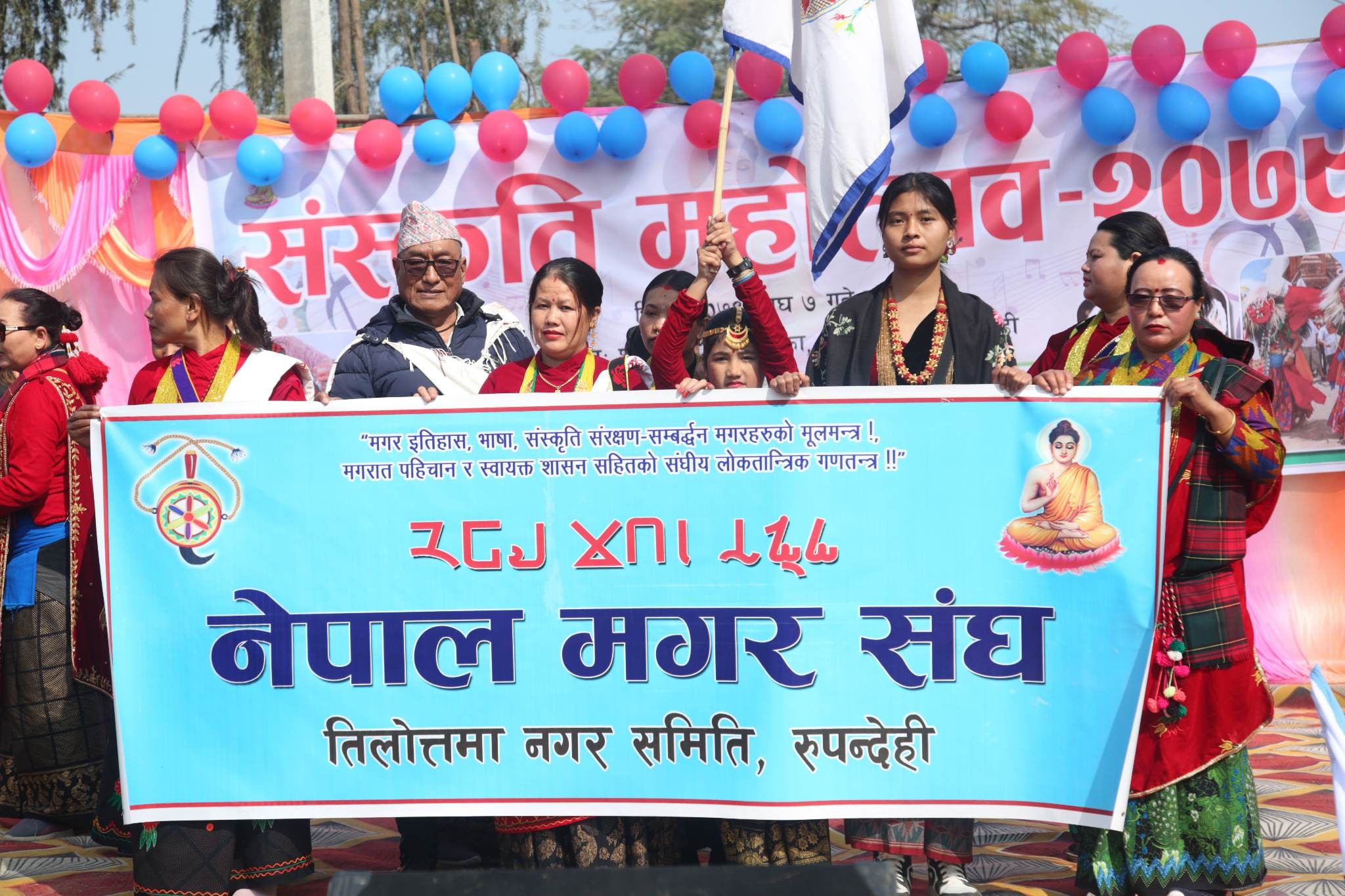 संस्कृति महोत्सवको शुभारम्भ गर्दै नेपाल मगर संघका केन्द्रिय उपाध्यक्ष गिता सारु मगरले नेपाल बहुजातिय बहुभाषिक र बहुधार्मिक देश भएपनि एकल जातिय शासन प्रणालीले राज्यसत्ता भन्दा बाहिर रहेकाहरुको राज्यसम्मको पहुँचमा अंकुश लगाउदै आएको बिचार व्यक्त गर्नु भयो। आफ्नो भाषा, कला साहित्य र संस्कृतिको संरक्षण र सम्बर्द्धन गर्न हरेक पुस्ताले संघर्ष गरिनु पर्ने बाध्यताको अन्त्यका लागि राजनैतिक संघर्ष अनिवार्य रहेको समेत उपाध्यक्ष सारुले बताउनु भयो । महोत्सवका प्रमुख अतिथि समेत रहेका उपाध्यक्ष सारुले भाषा, कला साहित्य र संस्कृति लोप भएमा त्यो जाती र समुदायको अस्तित्व तथा पहिचान समेत हराउने उल्लेख गर्दै आफ्नो भाषा, कला साहित्य र संस्कृतिको संरक्षण र सम्बर्द्धनका लागि नयाँ पुस्तामा हस्तान्रण गर्नु आवस्यक रहेको बताउनु भयो।