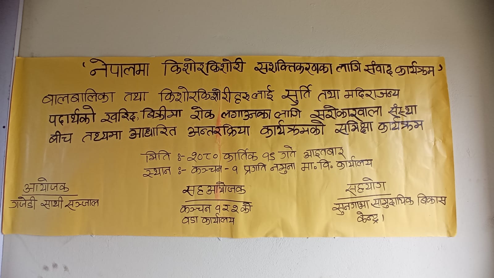 रुपन्देहीको कञ्चनमा किशोर किशोरीशसक्तीकरणका लागि संवाद कार्यक्रम अन्तर्गत बालबालिका तथा किशोर किशोरीहरुलाई सुर्ति तथा मदिराजन्य पदार्थको खरिद बिक्रीमा रोक लगाउन सरोकारवाला संस्थाहरु बिच अन्तरकृया कार्यक्रम गरिएकोछ।