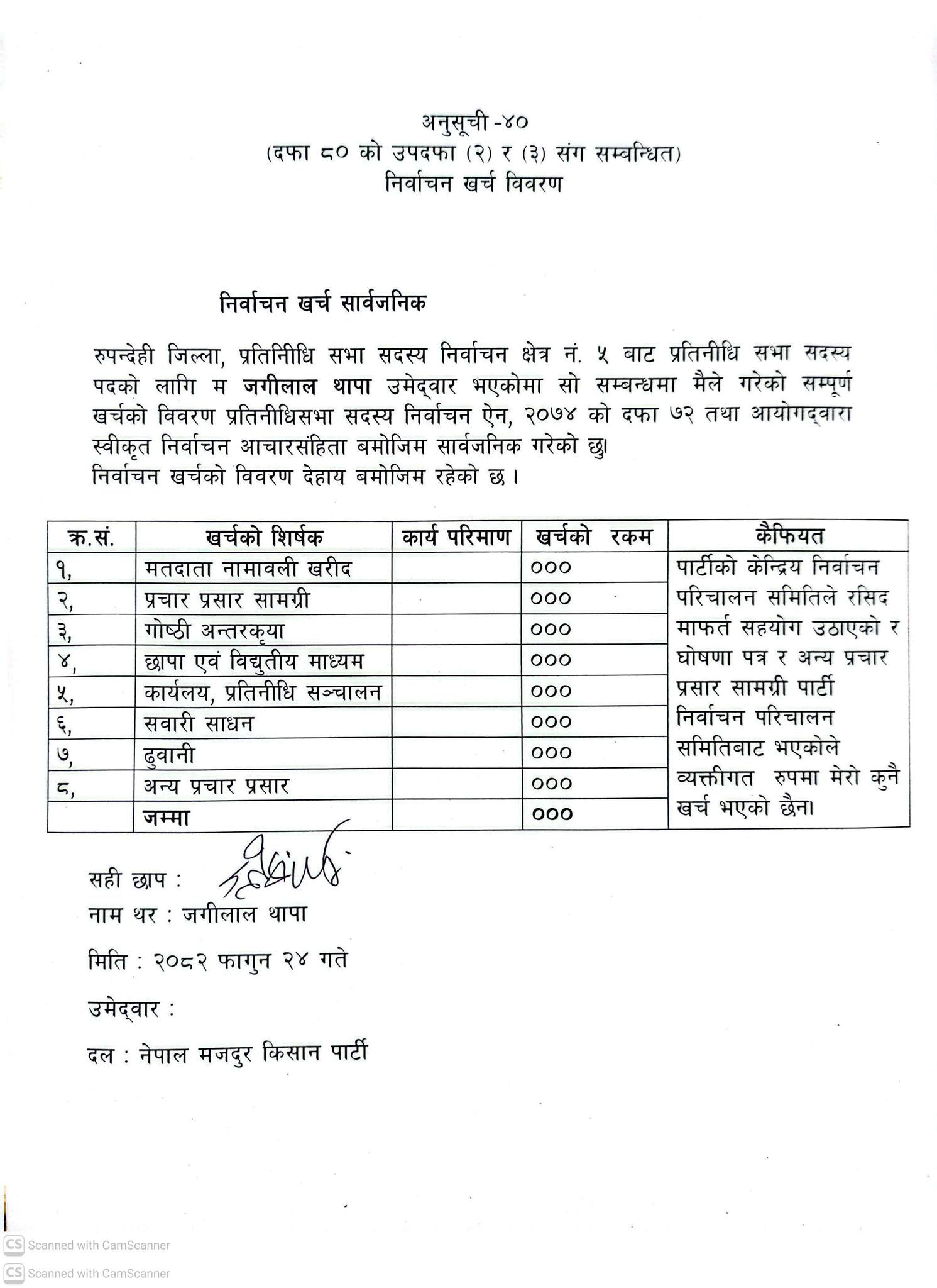 फागुन २१ गते सम्पन्न भएको निर्वाचनमा नेपाल मजदुर किसान पार्टीको तर्फबाट रुपन्देही क्षेत्र नं. ५ का उमेद्वार जगीलाल थापाले निर्वाचन खर्च सार्वजनिक गरेका छन। निर्वाचनको समयमा भएको सम्पूर्ण खर्चको विवरण प्रतिनीधि सभा सदस्य निर्वाचन ऐन, २०७४ को दफा ७२ तथा आयोगद्वारा स्वीकृत निर्वाचन आचारसंहिता बमोजिम प्रस्तुत गर्नु पर्ने प्रावधान अनुसार उमेद्वार थापाले आज सामाजिक सञ्जाल फेसबुक मार्फत सार्वजनिक गरेका हुन ।