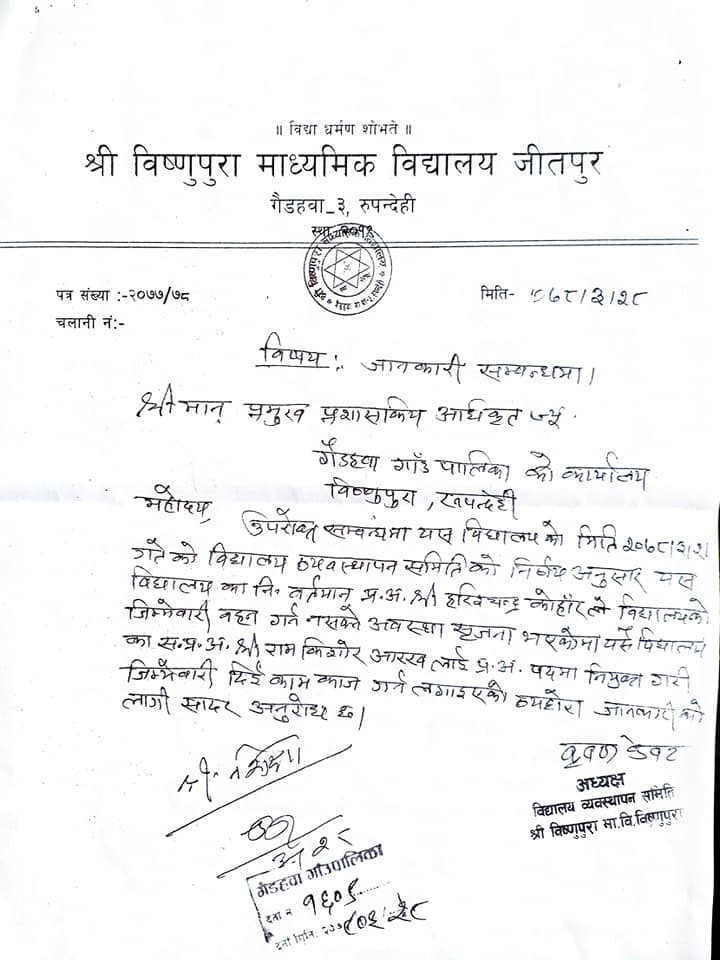 बिधालयको लेटरप्याडमा बि.व्य.स.को अध्यक्षले हस्ताक्षर गरी पत्र लेख्न पाइदैन।तर बिष्णुपुरा माध्यमिक बिधालयको लेटरप्याडमा सो बिधालय व्यबस्थापन समितिका अध्यक्ष कृष्ण केवटले हस्ताक्षर गरी बिधालयको प्रधानाध्यापक परिबर्तन गरी नयाँ प्रधानाध्यापक नियुक्त गरिएको जानकारी पत्र गाउपालिकामा पठाएका छन। जसमा चलानी नं. उल्लेख समेत गरिएको छ।