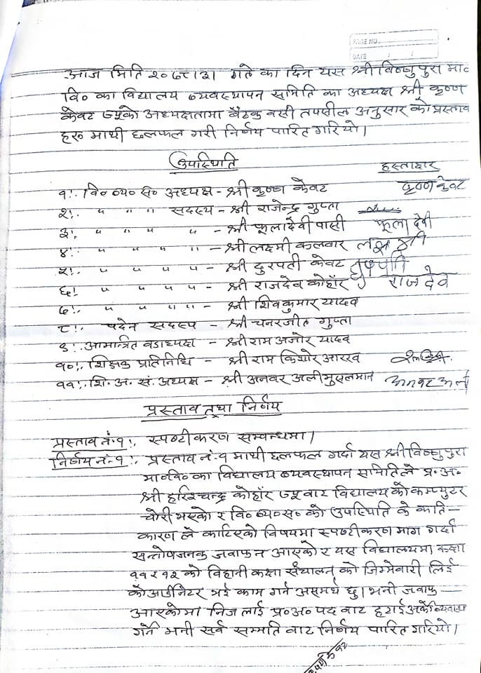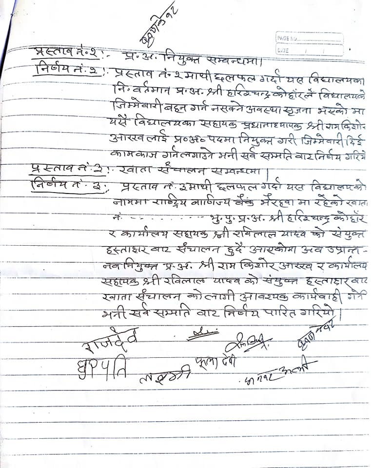 बिधालय ब्यबस्थापन समितिका अध्यक्ष कृष्ण केवटको अध्यक्षतामा बसेको बैठकमा साल र महिना उल्लेख गरेको भएपनि गते नै उल्लेख गरिएको छैन ।मिति उल्लेखै नगरी भएको बैठकको निर्णय नं. २ मा बिधालयको जिम्मेवारी बहन गर्न नसकेको भन्दै प्रधानाधयापक हरिशचन्द्र कोंहारलाई प्रधानाध्यापक पदबाट हटाई बिधालयका सहायक प्रधानाध्यापक राम किशोर आरखलाई प्रधानाध्यापक पदमा नियुक्त गर्ने निर्णय गरेको छ। समितिका पदेन सदस्यको रुपमा रहेका वडा नं. ३ का वडा अध्यक्ष राम ओजर यादव, वडा सदस्य चरनजित गुप्ता र सदस्य सचिव तथा प्रधानाध्यापक हरिश चन्द्र कोहाँर समेतको उपस्थिति बिना भएको बैठकको निर्णय नं. ३ मा प्रधानाध्यापक हरिशचन्द्र कोहांर र कार्यलय सहायक रविलाल यादवको संयुक्त हस्ताक्षरमा संचालित बैंक खाता नव नियुक्त भनिएका राम किसोर आरख र का.स. रविलाल यादवको संयुक्त हस्ताक्षरबाट खाता संचालन गर्ने समेत निर्णय गरेको छ।