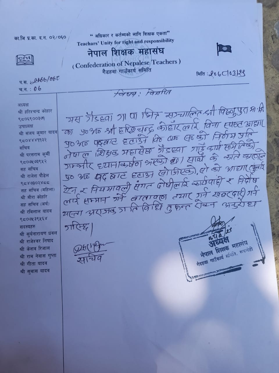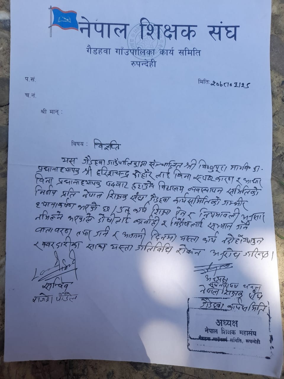 नेपाल शिक्षक महासंघ,गैडहवाको तर्फबाट ज्ञापन पत्र बुझाउदै किर्ते निर्णय पुस्तिका बनाई बिधालयका प्रधानाध्यापक तथा सदस्य सचिवको उपस्थिति बिना बैठक बसी मौजुदा प्रधानाध्यापकलाई हटाई नयाँ प्रधानाधयापक नियुक्ती गर्ने, किर्ते लेटर प्याड र छाप प्रयोग गरी नयाँ प्रधानाध्यापक र कार्यलय सहायकको नाममा बिधालयको बैंक खाता संचलान गर्ने जस्ता निर्णय गरी गाउपालिकालाई जानकारी दिने जस्ता निर्णय गरेको बिधालयका प्रधानाध्यापक हरिशचन्द्र कोहांरले बुधवार गैडहवा गाउपालिकाको कार्यलय परिसरमा आरोप लगाएका छन। ज्ञापन पत्रमा म के कति कारणले बिधालयको प्रधानाध्यापक पदबाट हटाउने निर्णय भएको हो, बिधालयको सम्पुर्ण लेटर प्याड,छाप र बि.व्य.स.को निर्णय पुस्तिका प्रधानाध्यापकको कार्यकक्षमा रहेको अवस्थामा अबैध निर्णय पुस्तिका र लेटरप्याडमा गाउपालिकालाई सिफारिस पत्र लेख्नुले बिधालयको गरिमामा आंच पुराएको आरोप लगाउदै बि.व्य.स.को नाममा अबैध कृयाकलाप गर्ने माथी आवस्यक छानबिन गरी कार्वाही गर्नुको साटो गाउपालिकाले तिनै व्यक्तिहरुलाई प्रशय दिदै आइरहेको समेत प्रधानाधयापक कोहांरले आरोप लगाए । बि.ब्य.स.को नामबाट गाउपालिकामा पठाइएको भनिएको निर्णय पुस्तिकामा बैठक बसेको न मिति छ न त गाउपालिकालाई लेखिएको पत्रमा चलानी नम्वर छ भन्दै प्रधानाध्यापक कोहांरले बि.व्य.स.का अध्यक्षको मनोमानी र स्वेच्छाचारी कृयाकलापको अन्त्य गरी बिधालय भित्र हुने अराजक गतिबिधी तुरुन्त रोक्न समेत गाउपालिका समक्ष आग्रह गरे ।