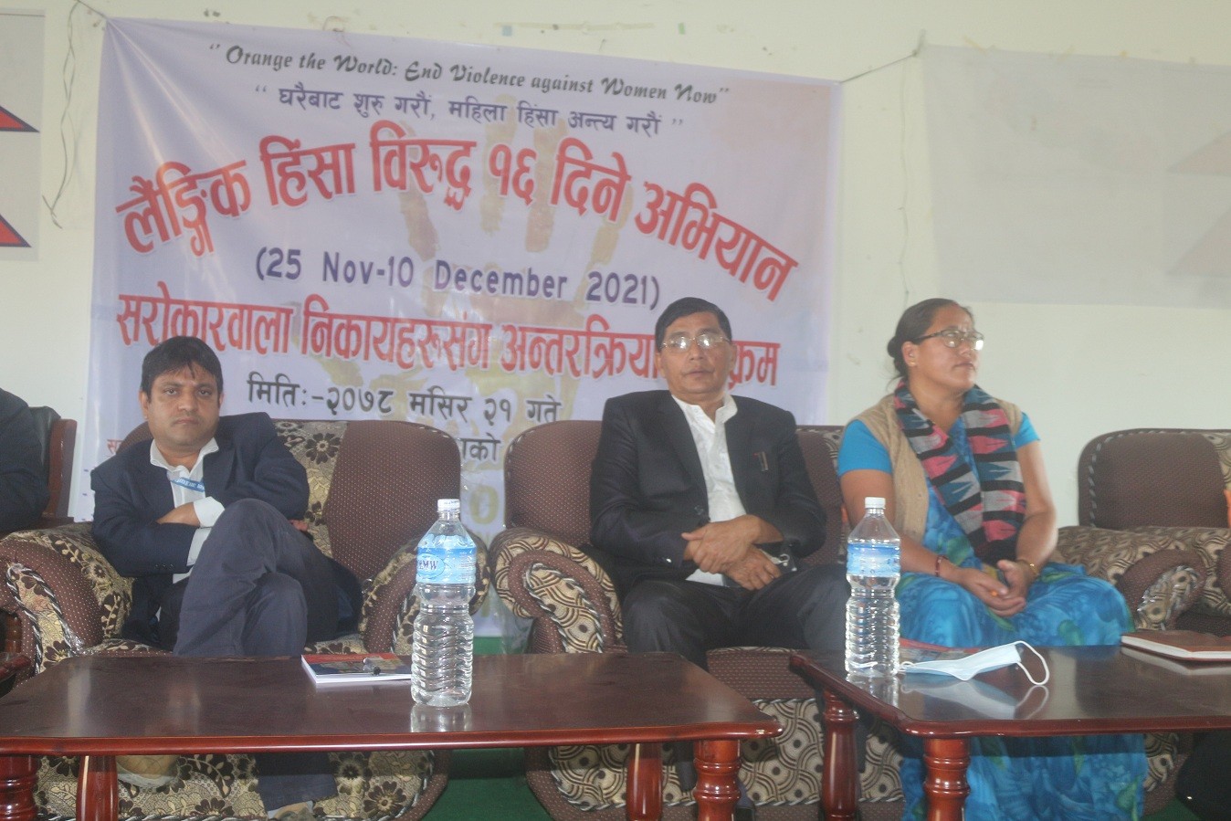 सामुदायिक बन उपभोक्ता महासंघ,रुपन्देहीका अध्यक्ष दीनानाथ आचार्यले समाजमा हुने बिकृतिजन्य महिला हिंसा, यौन दुराचार, शारिरी श्रम शोषण, मानसिक हिंसाको अन्त्य गर्न सरोकारवालाहरु नै सचेत र संगठित हुनु पर्नेमा जोड दिनु भयो । शैक्षिक र आर्थिक रुपमा पछाडी पारिएका समुदाय, सामाजिक तथा सांस्कृतिक रुपमा पछि परेका समुदायहरुमा बढी महिला हिंसा हुने गरेको सरस्वती माधयमिक विधालयका प्रधानाध्यापक शिवकला खनालले उल्लेख गर्नु भयो ।
